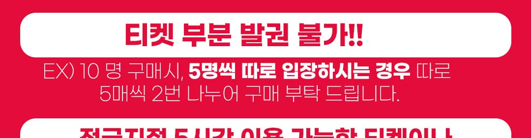 ex)  10 명 구매시, 5명씩 따로 입장하시는 경우 따로 5매씩 2번 나누어 구매 부탁 드립니다.​
