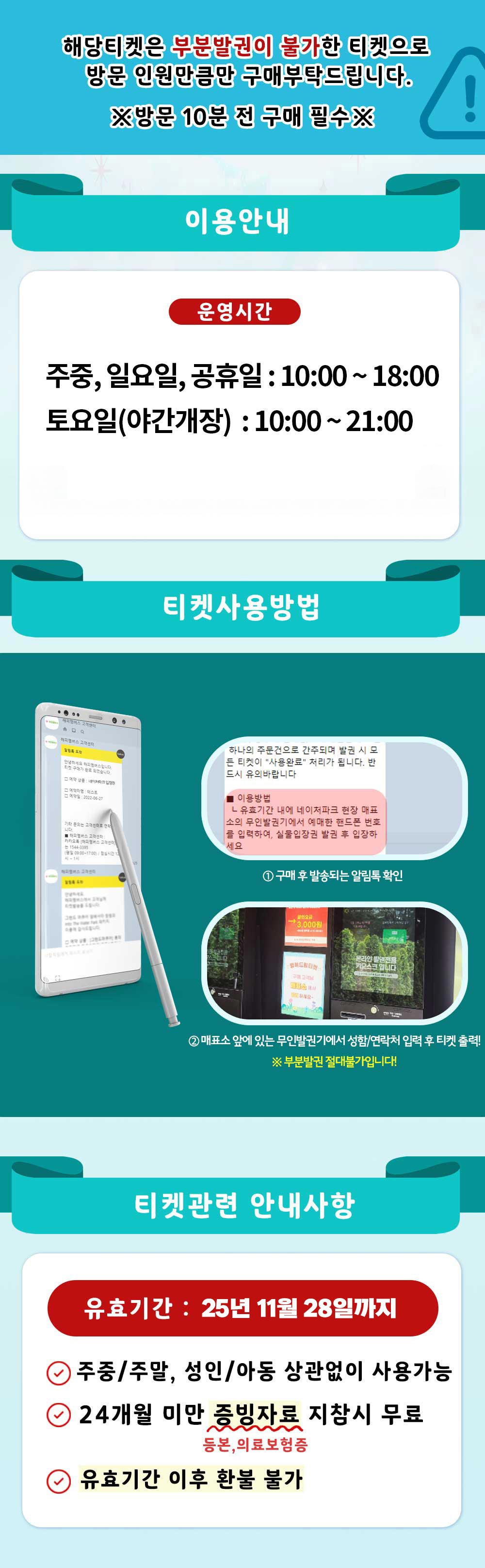 본 티켓으로는 단체 입장이 불가하며, 단체 구매 및 입장은 현장 문의 혹은 네이처파크 1688-8511로 문의 부탁드립니다.